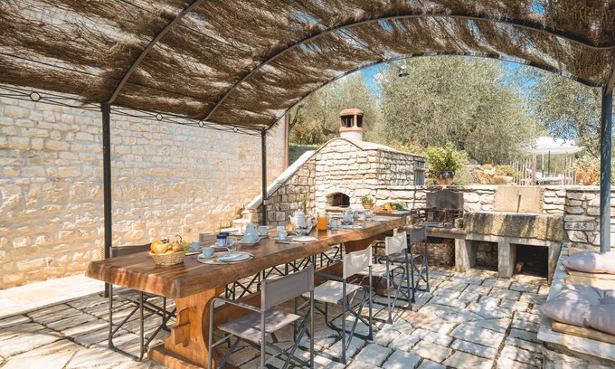 Connected with the kitchen, you find a gazebo organized for dining al fresco or just relaxing with BBQ and pizza oven. The area around the villa is arranged as a country garden, including centuries old olive trees.
