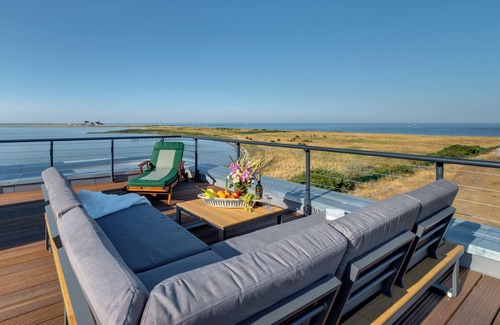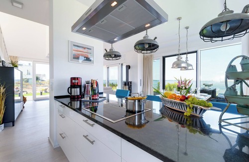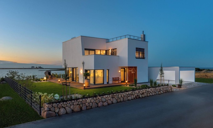 Luxury villa by the sea with 2 sun terraces, garden, large roof terrace, Finnish sauna, fireplace and bathtub with sea view. The "Lighthouse" albatross villa, completed in July 2018, not only impresses with its beautiful location directly on the water, but also with the light-flooded rooms, which have been furnished with attention to detail. A large garden right on the water with beautiful planting borders on the one hand on the large sun terrace and on the other hand on the water. A hammock, a large dining table, sun loungers and a beach chair await our guests here. The panoramic glazing in the entire house offers a beautiful view of the sea and the garden.