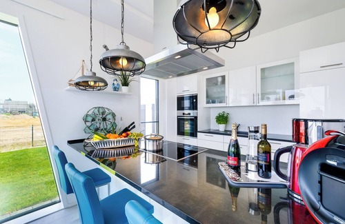 The kitchen offers extensive equipment that leaves nothing to be desired. The hob is aligned with the large panoramic window front, so that the view of the garden and the mucus outlet can also be enjoyed while cooking. A stereo system, an internet radio, a games collection for young and old and a large smart TV complete the picture. From the living area it goes to the large sun terrace, which in addition to plenty of space also offers a beach chair, a seating area and a hammock.