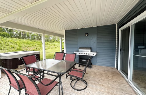 Spend your evenings soaking in the hot tub overlooking the country view, or relax on the patio furniture located beneath the covered deck.