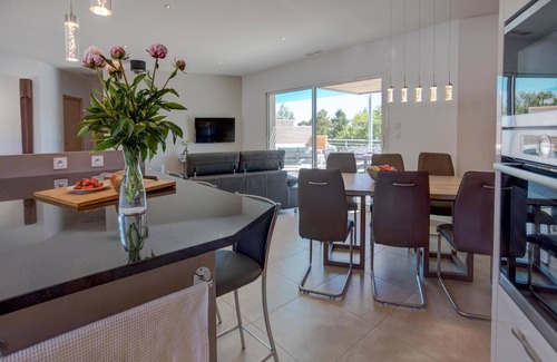 Set on a fenced 1,800 m² plot, this beautifully designed 3-bedroom villa offers complete privacy, a private pool, and expansive terraces for relaxing in the Mediterranean sun. Tastefully decorated by an interior designer, it blends modern comfort with elegant style. Inside, you’ll find a spacious living room, a fully equipped kitchen, and air-conditioned bedrooms for restful nights. Outside, enjoy a swim in the pool, dine in the outdoor kitchen, or unwind with a glass of wine in the shaded lounge area.