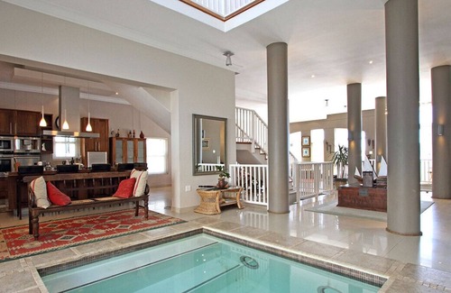 5 bedroom villa with spacious bedrooms, beautiful sea and mountain views from front balcony and lounges with private barbeque area at the back with rim flow waterfall from the outside pool. Large open plan entertainment areas with indoor pool well equipped kitchen, dining room, lounging area and reception hall and separate formal lounge. An imposing entrance hall with a grand staircase and columns lead you up to the main entertainment area. The villa is located in a quite secure suburb and boarders onto the nature reserve. Close to beaches and restaurants and shops