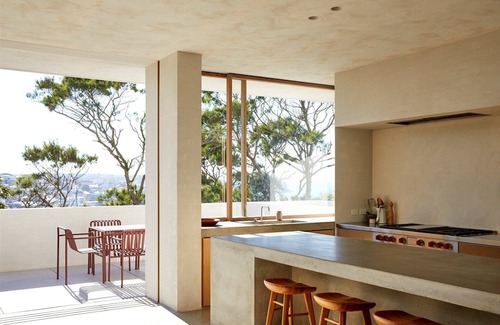From the oversized entry with plenty of room for beach essentials, shoes and all you need a few steps takes you into the heart of the home; the combined living, kitchen and dining area (middle level of house). It is drenched in sunlight and hugged on both sides by private outdoor areas. On one side showcasing the ocean and glimpses of the beach and the other side the inviting private courtyard with its Mediterranean sleek design. This social area offers plenty of room for everyone to gather around the kitchen bench to see dinner be prepared (or unpacked from delivery from one of the many nearby restaurants) , hang out by the TV or fire place and sit down for food. Of course you can choose to sit down at the dinner table inside or out on the deck. It is also a truly special place for a solo early riser to meet the new day in peace on the terrace. Maybe enjoying a post swim beverage and freshly baked goods from a nearby bakery.
