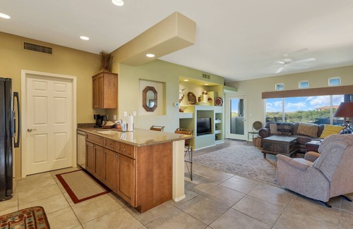 Charming, updated and luxuriously furnished condo overlooking the Vistoso Nature Preserve in gorgeous Rancho Vistoso area of Oro Valley! Mountain Views from all sides and surrounded by lush desert vegetation and wildlife. Living room features a high-end, comfortable leather sectional and cozy recliner. Large dining table for 6 and breakfast bar for 2 with a view of the Catalina mountains from dining room. Separate laundry room is off kitchen, which has upgraded appliances and is fully equipped to cook at home. Master bedroom has a king bed with walk-in shower and huge walk-in closet. Split floor plan offers second bedroom on the opposite end of the condo with a queen-sized bed and shower/tub bathroom located right across the hall. Large, private balcony showcases the beautiful Vistoso Nature Preserve with a perfect view of spectacular desert sunsets over the Tortolita and Tucson Mountains. Cable TV and ultra high-speed internet (with Wi-Fi) included. This property does not allow smoking or pets.