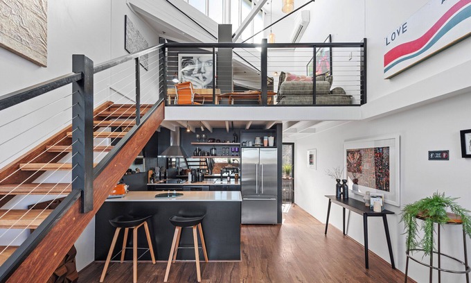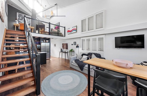 Oozing New York loft-style architecture, exposed brick walls, steel beams, double height pane glassed windowed ceiling & plantation shutters on both bedroom windows.