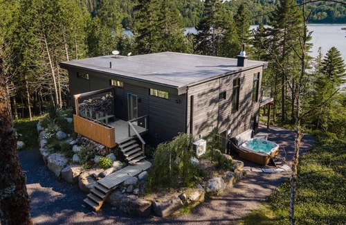 A truly stunning luxury waterfront chalet located in the heart of the Laurentians mountains, 15 min from Ste-Agathe hub. A short 1h20 from Montreal and 2h15 from Ottawa. 2020 built with luxury finishes throughout. Positioned on a south facing lot, the cottage basks in sun all day long while enjoying jaw dropping views. Fast wifi, hot tub, 12 acres of forest, close to ski slopes.