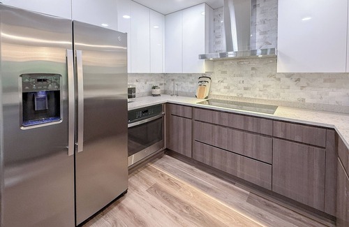 A 36-inch deep KRAUS sink is paired with a commercial-grade trash compactor and MOEN® faucet, creating a seamless balance of performance and elegance.