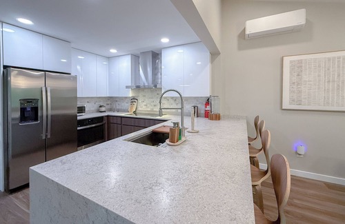 Additional features include a built-in oven, fridge with filtered water and ice, and a fully stocked coffee and tea bar with Keurig and drip machines, alongside every tool from silverware to blender.