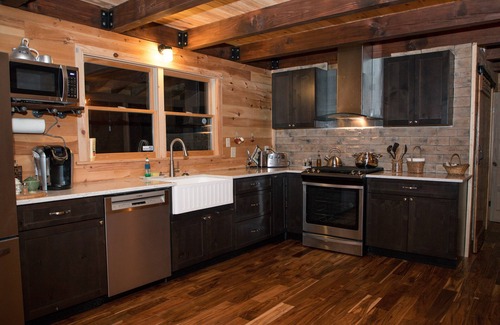 The cabin was purchased from a cabinetmaker who milled each board and cherry wood beam by hand, then meticulously crafted every inch of the cabin. Upon entering you will be awestruck by the 15' stone fireplace with 50 in. tv above mantel, chalet windows, cherry wood beams and luxury kitchen with quartz countertops, propane stove, glass range hood set in a rustic stone wall.