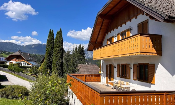 Modern 2-family house "LuxuSölk", renovated in 2023. 300 m from the centre of Stein an der Enns, on the outskirts, 15 km from the centre of Haus im Ennstal, 20 km from the centre of Schladming, in the countryside. For shared use: garden (fenced). Garden furniture, barbecue, children's playground. In the house: sauna, hot tub (extra). Relaxation room, spa area (extra), storage room for skis. Parking (for 2 cars) on the premises. E-charging station. Shop, restaurant 300 m, bus stop 250 m, railway station "Stein an der Enns" 300 m, outdoor swimming pool 5 km, indoor swimming pool 5 km, bathing lake "Aich" 10 km. Golf course (18 hole) 16 km, ski lift 10 km, slopes 10 km. Well-known ski regions can easily be reached: Hauser Kaibling 14 km. Well-known lakes can easily be reached: Steirischer Bodensee 17 km, Putterersee 18 km. Hiking paths: Großsölk / Naturpark Sölktäler 6 km. Charging of electric cars at the house possible for a fee (depending on consumption).