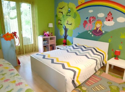 Food & DrinkTea/Coffee maker, Chocolate/Cookies, Bottle of waterBathroomHairdryer, Private bathroom, Toilet paper, Shampoo, Shower, Bathtub or shower, Bathtub, Body soap, Towels, ToiletMedia & TechnologyTV, Cable channelsGeneralSmoke Alarm, Fan, Heating, Trash cans, Key access, Iron, Private entrance, Ironing facilities, Tile/Marble floorKitchenHigh chair, Stovetop, Microwave, Refrigerator, Coffee machine, Cleaning products, Wine glasses, Oven, Dryer, Kitchen, Dining table, Electric kettle, Kitchenware, Dishwasher, Washing machineLiving AreaSofaViewQuiet street view, Garden view, ViewBedroomChildrens' cribs, Wardrobe or closet, LinensOutdoorsBarbecue, Outdoor dining area, Outdoor furniture, TerraceAccessibilityEntire unit located on ground floor, Adapted bathRoom AmenitiesSocket near the bed, Fold-up bed, Non-feather pillow, Drying rack for clothingEntertainment & Family ServicesBoard games/puzzles, Baby safety gates, Books, DVDs or music for children |