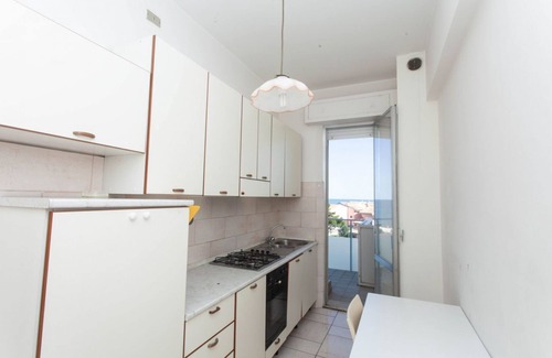 Description: fourth and last floor of a completely renovated building. Large panoramic living room overlooking the sea with two double sofa beds and dining table – new kitchen with dishwasher – double bedroom – second bedroom with two single beds (or double if necessary) – bathroom with shower cubicle and washing machine – small terrace with sea view equipped with table and chairs with wonderful panoramic sea view. Reserved parking space inside the condominium courtyard.