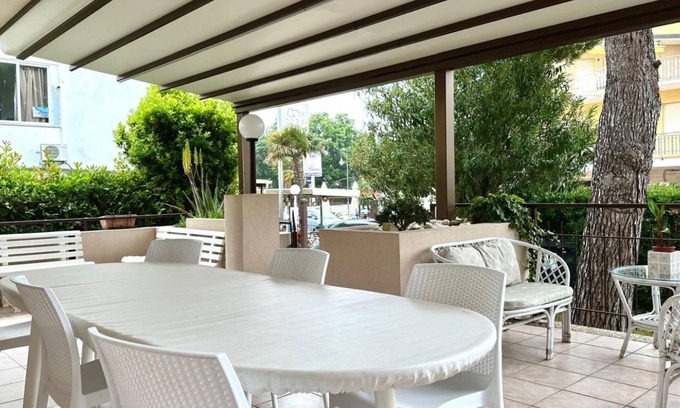 Description: ground floor of a small building, with large equipped patio and direct access to the beach. Entrance to living room with French sofa bed, dining table and kitchenette with dishwasher - bedroom with double bed - second bedroom with double bed and single sofa bed - bathroom with shower cubicle and washing machine - wonderful fenced porch with table, chairs and sofas. New furnishings, air conditioning in every room.