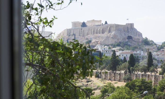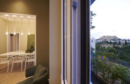 This is a 1240 ft² ground and first floor suite, situated in a fully renovated grand historic neoclassical house of 1930 with high ceilings consisted by one living room, one dining room, one kitchen, one big hallway, three bedrooms and two full bathrooms. The house is built at the foot of a hill so the suite is on the ground floor from the side of the street and on the first floor from the side that overlooks Acropolis and the temple of Zeus. Just in front of the house there is an archaeological site, the temple of Artemis Agrotera. It has one balcony and big openings with fantastic unobstructed views of Acropolis, Temple of Zeus, National Garden, Zappeion, Filopappou and Lycabettus Hills from the interior of the suite.