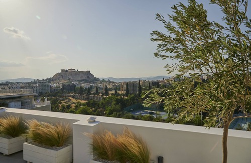 The suite is situated in a fully renovated grand neoclassical house with high ceilings. The 1240 ft² first floor has one living room, one dining room, one kitchen, one big hallway, three bedrooms and two full bathrooms. There is an extra bedroom of 270 ft² (the fourth) located on the roof garden, which has an ensuite bathroom that is separate from the first floor suite. Just in front of the house there is an archaeological site, the temple of Artemis Agrotera. It has balconies back and forth and big openings with fantastic unobstructed views of Acropolis, Temple of Zeus, National Garden, Zappeion, Filopappou and Lycabettus Hills from the interior of the suite. Another unique feature is the private roof garden that can be accessed through an external staircase and offers the best views in Athens.