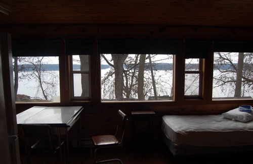 1 bedroom lakeview cabin with a kitchen and screened-in porch in "The Highlands." A few extra steps from the water with an UNBELIEVABLE view. Features one bedroom with queen bed and 2 twin beds in the main room that can be "bunked up" or "bunked down". We no longer provide cots, but there's plenty of room for you to bring your own air mattress.