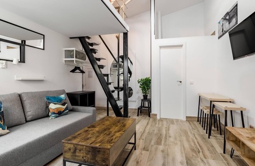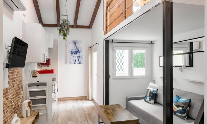 The studio includes a single bed on a mezzanine level, and in the living area you’ll find a sofa bed and a Smart TV — perfect for unwinding with a good movie after a long day of work or study in Madrid. A small table completes the space, making it feel just like home.