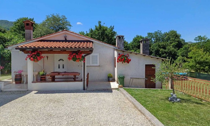 Single-family house "Magdalena", renovated in 2019. In the hamlet Donji Kralji 3 km from the centre of Pićan i Podpićan, 13 km from the centre of Pazin, 60 km from the centre of Pula, 20 km from the sea. Private: property 2'000 m2, lawn and wildlife garden, swimming pool (above ground) (4.80 m diameter, depth 120 cm, seasonal availability: 04.Jun. - 30.Sep.). Outdoor shower, terrace, garden furniture, barbecue. In the house: internet access, washing machine. Parking (for 2 cars) on the premises. Supermarket 3 km, bus stop 12.8 km, pebble beach 20 km. The owner does not accept any groups.