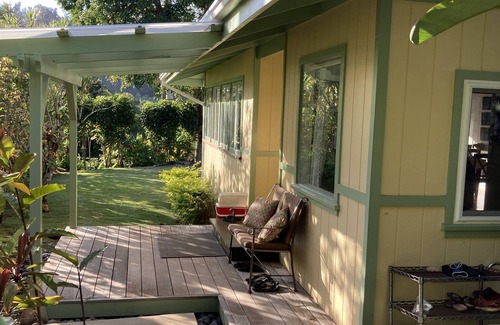 Beautiful views of green mountains from backyard. Lush plant life, including mango, grapefruit, banana and lemon trees. Outdoor shower sheltered by tropical foliage. This is a small but charming and tastefully furnished plantation-style cottage with the feel of real Hawaii. Within five minutes drive of gorgeous sandy beaches: incredible snorkeling at Tunnels and Ke'e Beaches, world class surf at Hanalei Bay and picturesque Lumahai.
