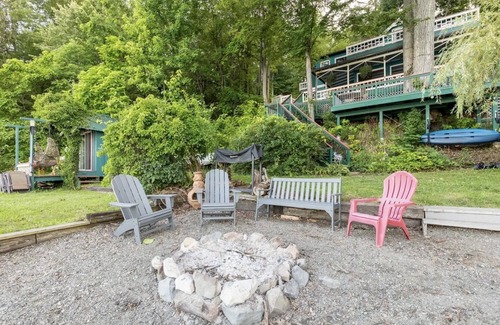 Guests have access to the whole property and house. The house is located on an acre that slopes from Taughannock Boulevard down to 100 feet of frontage on Cayuga Lake. There’s lots of space inside and out for guests to socialize, including a large dining table on the giant porch, a fire pit, a picnic table on the dock, and a small yard by the lake.