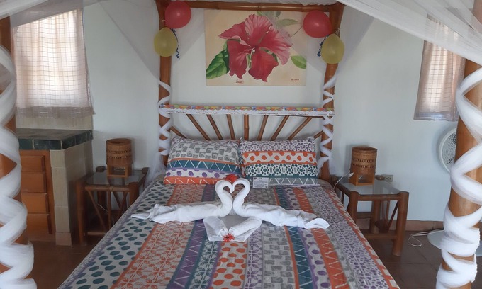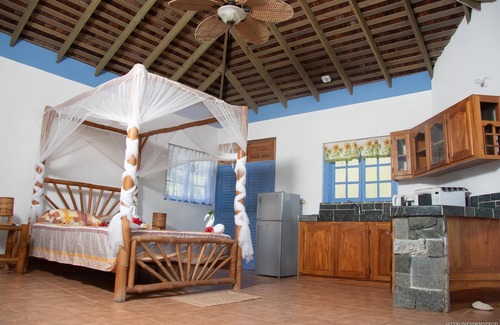 Moonlight Magic Suite boasts a whirlpool bath encased in natural chalk stone with a bay window overlooking the sea! The queen size bamboo bed looks right out onto your own private beach. The kitchenette is made of handpicked and sanded marble counter tops. This unit is a complete private suite designed for just the two of you!