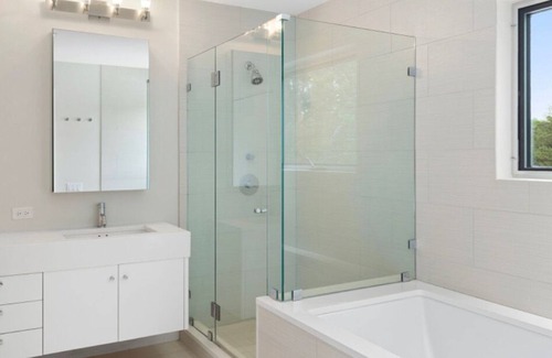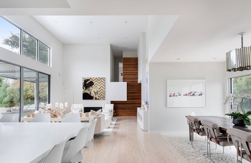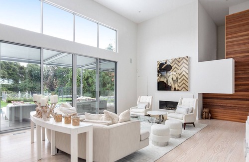 Enter to an open living plan with an expansive living/dining area. The spacious chef’s kitchen offers subzero and wolf appliances, plenty of sleek white Corian countertops, and bar top counter seating for 7. The kitchen is incredibly well stocked with basic ingredients (oils, vinegars, spices, etc), All-Clad pots and pans, chef's knives, baking equipment, and anything a true chef needs to create a perfect meal. For additional dining space, or for larger meals, indulge at the dining table with seating for 8-12 guests while overlooking the specially designed water feature and manicured landscaping.