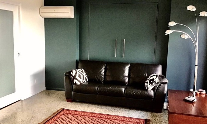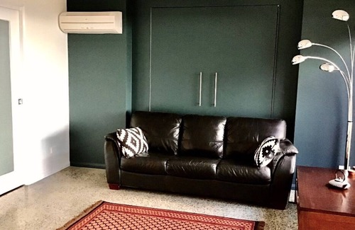 Comfortably sleeping 6 people in 3 queen-sized beds including a wall-bed in the sitting room. No need to fight over the bathroom, downstairs there is a large main bathroom and en-suite and upstairs a luxurious en-suite off the master bedroom. The kitchen has a wall oven and convection/microwave oven plus a well-stocked pantry so you can prepare a feast or, for more informal dining, cook up a barbie or order take-away. The separate laundry has a washing machine only.