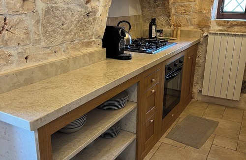 At the other end of the dining area you will find the WELL EQUIPPED KITCHEN which has more than enough cooking utensils, pots & pans and crockery for 14 people. It also has stone work-tops, a 5 ring gas hob, oven, sink, fridge/freezer, microwave, toaster, Nespresso coffee capsule machine and dishwasher. A door leads to the al fresco dining area.