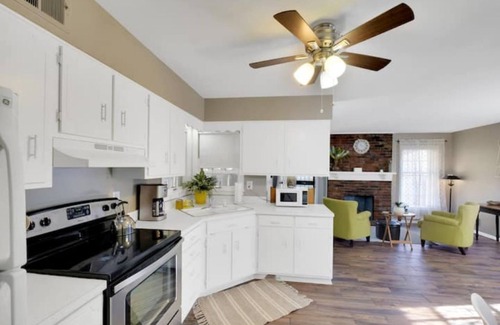 Relaxing brick ranch getaway in quiet, safe neighborhood with sidewalks, centrally located within the city limits. Less than 10 miles from anywhere in the city. 1500 sq. ft. plus house easily accommodates 8 people with plenty of space. 3 bedrooms with sleeper sofa, king size bed, 1 and 1/2 bath. Large three seasons room. 2 car garage, off street parking. Remote fireplace, office area, WIFI, cable. Smart locks.