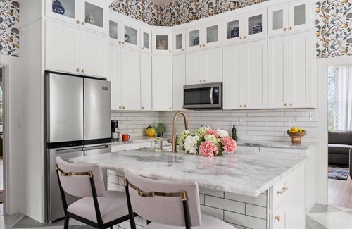 Bright, sun-filled fully stocked kitchen with island & stainless appliances