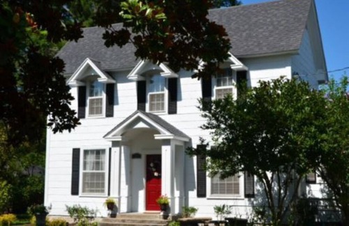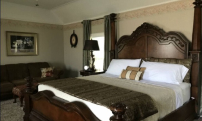 The Magnolia Suite is a secluded retreat on the second floor with a private bath, master suite with a king bed, and adjoining second bedroom with two twin beds. The master suite is furnished with a wardrobe, table and chairs, sofa, bed side tables with lamps, and a flat panel TV with streaming. An electric fireplace adds ambiance and provides for custom room temperature for added comfort. The second bedroom is furnished with 2 twin beds, desk, and lamp. An ensuite full bath completes this suite.