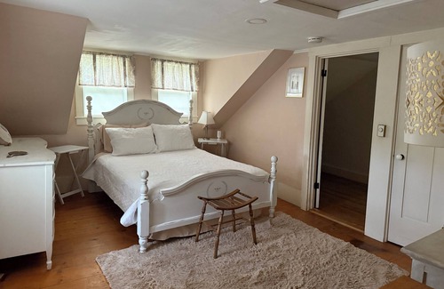 There is a dining room and living room as well as the library bedroom, which has a queen bed. The downstairs bathroom has a shower. The upstairs features beautiful 12" pumpkin pine boards. The upstairs has three bedrooms and a full bath with a tub. In total, four bedrooms and two bath. Plus a pull-out bed in the sunroom. The sunroom entry which leads out to the back yard.