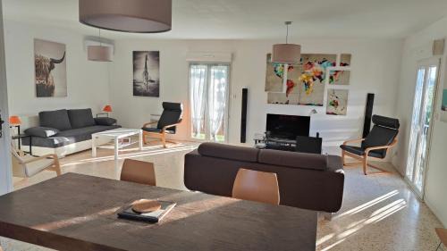 This property offers access to a balcony, free private parking, and free Wifi. The vacation home also offers an outdoor swimming pool and a garden for guests to relax in. Maison Climatisée pour vous seul avec piscine et jardin includes 3 bedrooms, 1 bathroom with a bath and a shower, a seating area, and a fully equipped kitchen. A flat-screen TV is offered. For added privacy, the accommodation features a private entrance. Beziers Cap d'Agde Airport is 23 miles from the property.