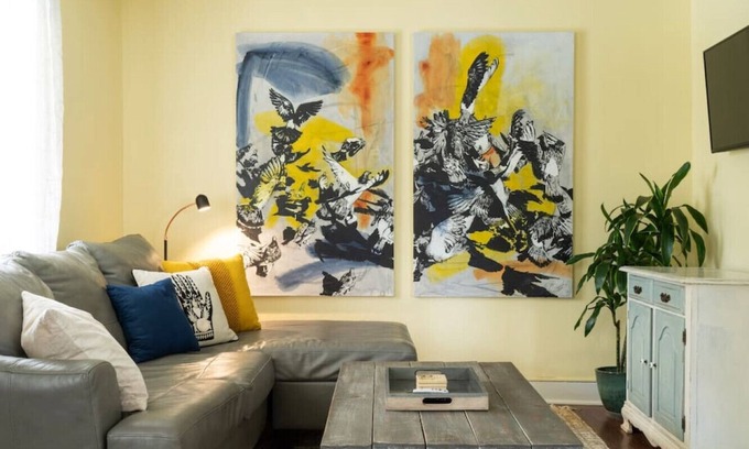 Decorated by award winning designer with yellows, blues, and a French/bird theme. Very bright and surprisingly spacious for the size. Hardwood floor in front room. Tile flooring in bedroom and bathroom, and beautiful granite tile flooring in kitchen.