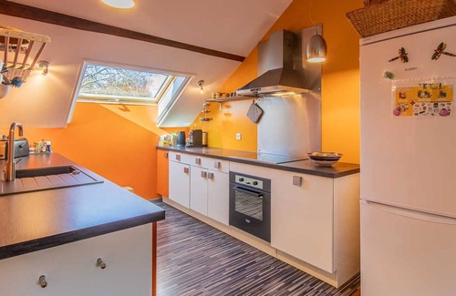 Swiss by origin and Burgundians by adoption, both passionate about nature and the environment, Hélène & Daniel open the doors to an authentic farmhouse typical of late 19th century countries (traditional farmhouse with fairly unusual) fully restored with care. In a small quiet rural hamlet nestled in the heart of the Bresse countryside, on the edge of pastures & fields, in the hollow of several forest areas dotted with wild ponds. Very comfortable cottage nestled under the roofs. Spacious & bright. Lovely resolutely contemporary character. Warm and original, colorful and vitamin "pop" atmosphere. Lots of style & charm. Pleasant sheltered private terrace located on the ground floor of the house. Large enclosed and very neat property of 7000m², planted with trees and flowers including a rare & bucolic small private natural swimming pond with dedicated pontoon (welcoming sweet carp & frogs), a trampoline, a ping-pong table , an original "fireside" (for the pleasure of a brazier "under the stars") and a bread oven (made available on request by the owners). Literal playground and relaxation for young and old. You also have access to a large common room offering a large library, a DVD library & a large number of board games and small leisure equipment. Composition: Gîte on the 1st floor of the owners' house (totally independent / single common entrance on the ground floor) on a property also including 3 unusual accommodations (2 caravans and a cabin). Wireless. Oil central heating. Living room-kitchen-living room, 2 bedrooms, one of which can be converted into a large living room if necessary (bed 2 p. 160x200cm / bed 2 p. 160x200cm + a BZ sofa that can be converted into a double bed of 140x190cm as an extra), bathroom (shower / Wc). Private sheltered terrace on the ground floor (courtyard side). Enclosed land of 7000m² in common (with private swimming pond). Private parking. Shops and amenities 5.5 km.