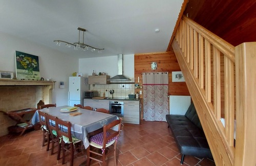 In this former forester's house, the gîte offers a comfortable standing, wooden interior, comprising on the ground floor, a fitted kitchen with dining room (dishwasher, etc.), a shower room, WC, storage space and washing machine.