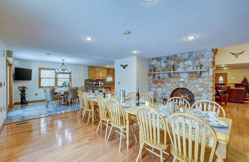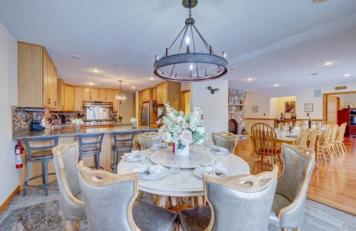 The common area includes a large entertainment and sitting area with a state-of-the-art big screen and surrounds sound for movies and special TV events. A movie theater in the basement, a playroom with billiards, an arcade, air hockey, and a ping pong table. A three-story stone fireplace offers a place to relax on comfortable chairs. The dining area is open to the kitchen and can seat 20+ people