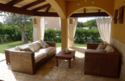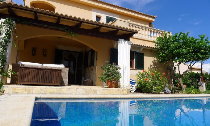 The lovely house, built in Majorcan style, is quietly located in an exclusive residential area of Can Picafort. Suitable for 6 adults and 2 small children. Pool, lawn, 6 chairs, BBQ, 3 terraces, outside lounge, satellite TV, WiFi, additional outdoor kitchen, 3 bedrooms, 2 bathrooms, 1 children's room. Absolutely children's friendly; cots and chairs, even strollers and car seats available. Solid wimming pool fance available (installed on request). This private home is well divided and luxuriously furnished.