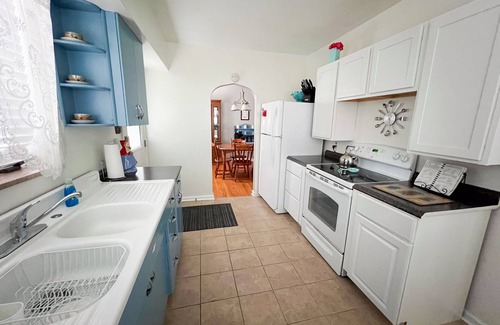 The home sleeps 4 people. The space includes a kitchen, dining room, bathroom, living room and 2 bedrooms. The master bedroom has a queen bed and the second bedroom has a full size bed. Living quarters are on one level with 4 stairs leading into the house and 2 stairs at the curb of house. Parking is available in the driveway to the left of the home. City ordnance does not allow parking on the street.