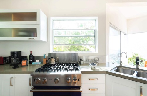 The pool house is airy and bright and furnished with authentic mid-century furniture. Full kitchen has a new, professional, restaurant grade Viking range, full size refrigerator and a microwave. Bathroom features a shower. Powerful A/C and heat keep the temperature perfect no matter the season.
