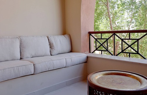 Discover the enchanting middle floor suite at Malkata House, where luxury meets the timeless allure of the desert. This exquisite suite boasts a majestic domed ceiling and a chic living space, complete with modern amenities like a mini-fridge, kettle, TV, and desk. The plush sitting area and expansive balcony offer tranquil views of our verdant gardens, shimmering pool, and the endless desert horizon. Retreat to the comfort of a grand bed, tailored to your preferences, in a secluded bedroom with generous wardrobe space and personalized climate control. The opulent bathroom features a walk-in shower, complete with a seat for a spa-like experience. Every aspect of Malkata House is meticulously designed for a memorable stay that epitomizes elegance and comfort.