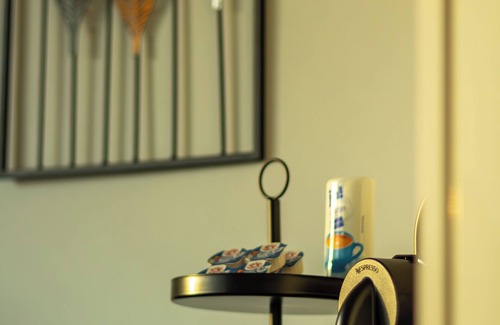 The kitchen is equipped with an oven, a stovetop, and a refrigerator, as well as a coffee maker, an electric kettle, and cookware. Bathroom amenities include a hair dryer, towels, and toilet paper. Other amenities include bed sheets, a desk, an ironing board, and heating.