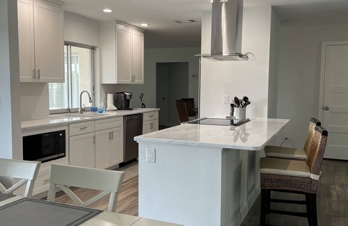 This house is fully equipped with everything you need to make your stay comfortable. Cable HDTV, (4 smart TVs) Blue Tooth Stereo and free Wi-Fi internet access. A spacious newly remodelled home with family room, den, and kitchen with all stainless appliances and utensils included. Three bedrooms and two full baths with top of the line Serta Mattresses, including one king, two queens, a queen sofa bed with gel foam mattress (in den) and an inflatable queen air mattress for your temporary visitors. The Living room has a separate couch (non-pull out). Each bedroom has its own TV. Plenty of space for up to 6 people in bedrooms along with additional room for another 2 using the pull out sofa and/or inflatable bed. The unit also includes a full size indoor laundry, pool/beach towels, 7 bicycles, fishing poles, and golf clubs in the two car garage.
