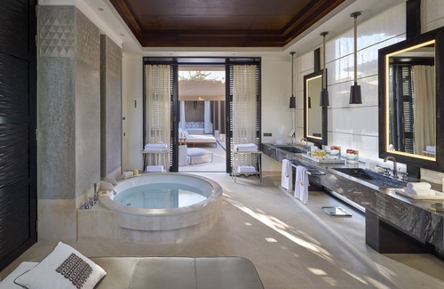 Mandarin Oriental, Marrakech offers 65 accommodations with private plunge pools and minibars. Rooms open to furnished balconies or patios. Accommodations offer separate sitting areas. Beds feature premium bedding. Televisions come with premium digital channels. Bathrooms include separate bathtubs and showers with deep soaking bathtubs and rainfall showerheads. Bathrooms are also outfitted with bathrobes, slippers, and designer toiletries.