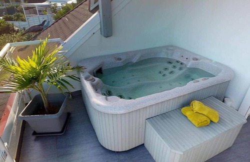 The apartment features a terrace with a lovely open view of Orient Bay — and a jacuzzi!