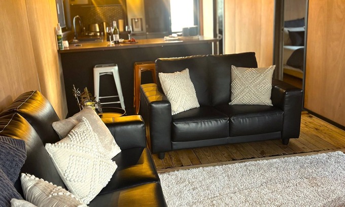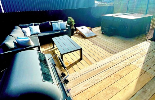Step into your moody, modern retreat just a 5-minute stroll from the lake. With your own two-bedroom hideaway, you'll soak in the calm and comfort of curated interiors and cozy nooks made just for you. Fire up the hot tub under the stars in your private outdoor space, or unwind inside where rich tones and textures set the perfect mood.
