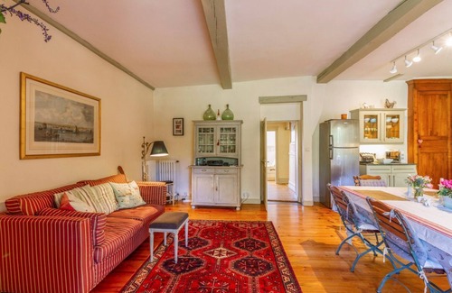 Step into the marble tiled hallway of this 19th century French maison and walk through to the sitting room with its high ceiling, ornamental fireplace and a cabinet with Smart TV (Netflix/Prime etc) and a DVD player. There is a light-filled dining room next door showcasing more antique pieces, alongside a modern shower room.
