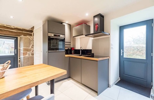 - Au rez-de-chaussée, découvrez une cuisine entièrement équipée avec un coin repas pour quatre personnes, une machine à laver et un accès vers le jardin.