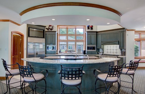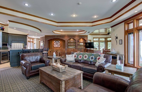 This property is the perfect destination for your family’s needs and desires! Enjoy gorgeous views, multiple sitting areas, private bedrooms, 8 fireplaces, 10 TVs, on-site laundry, and a spacious kitchen for meals and entertaining. The downstairs great room is a kid-friendly area for games or lounging on the sectional sofa and watching movies. The floor plan separates the kitchen from most bedrooms, ensuring quiet for early risers and sleepers. The mansion sleeps up to 20 guests with 5 private bedrooms/bathrooms (3 king beds, 2 queen beds) and a kids’ bunk room with bathroom downstairs (2 bunk beds with queen top and bottom, 1 futon bunk bed with twin on top).
