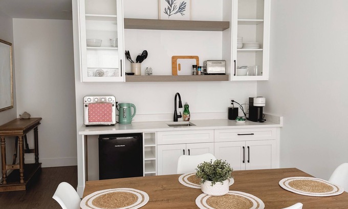 the suite includes a mini fridge, air fryer/toaster oven, kettle, and Nepsresso coffee. You’ll also find dishes, glassware, and utensils for easy breakfasts or light meals.